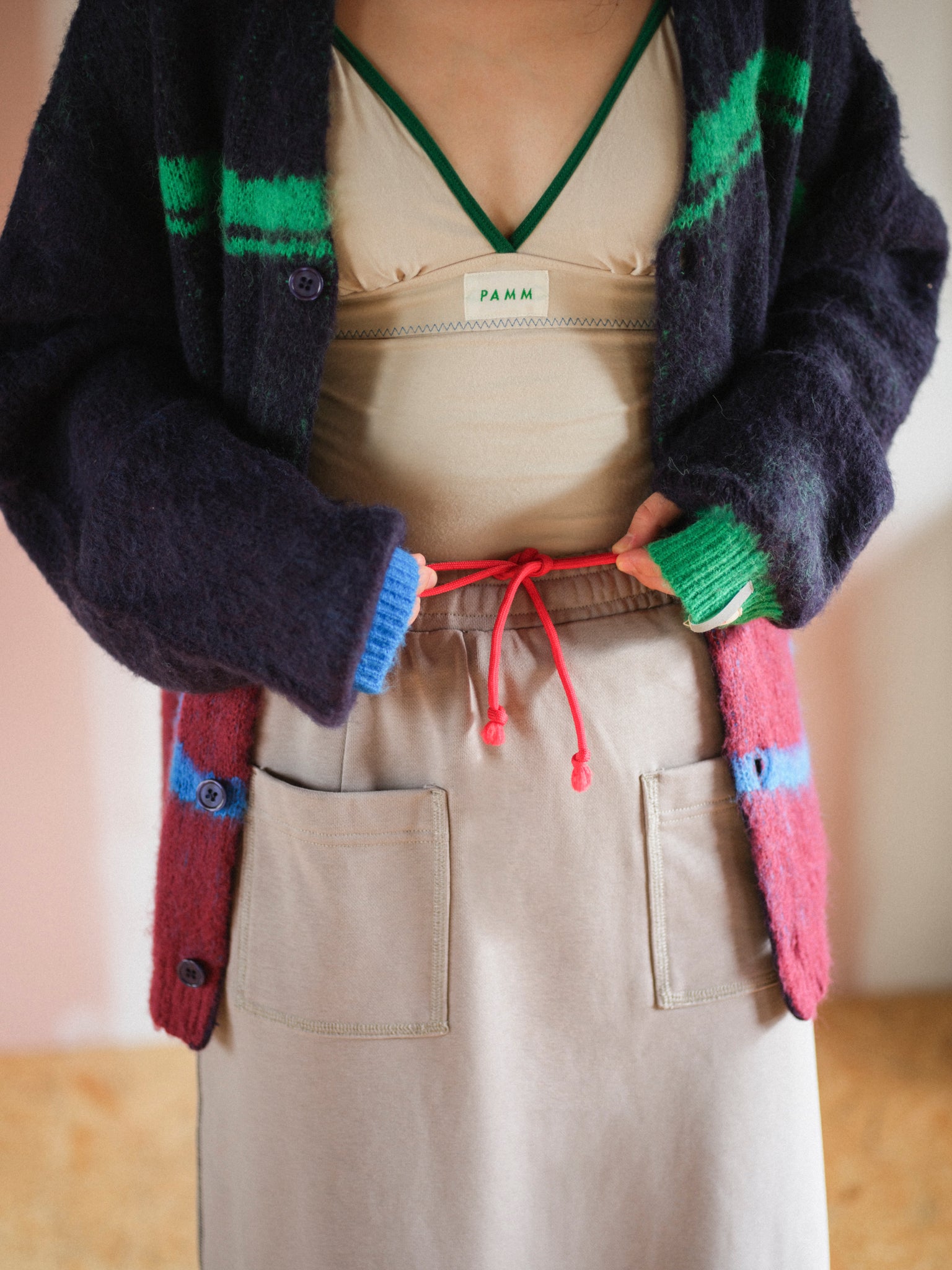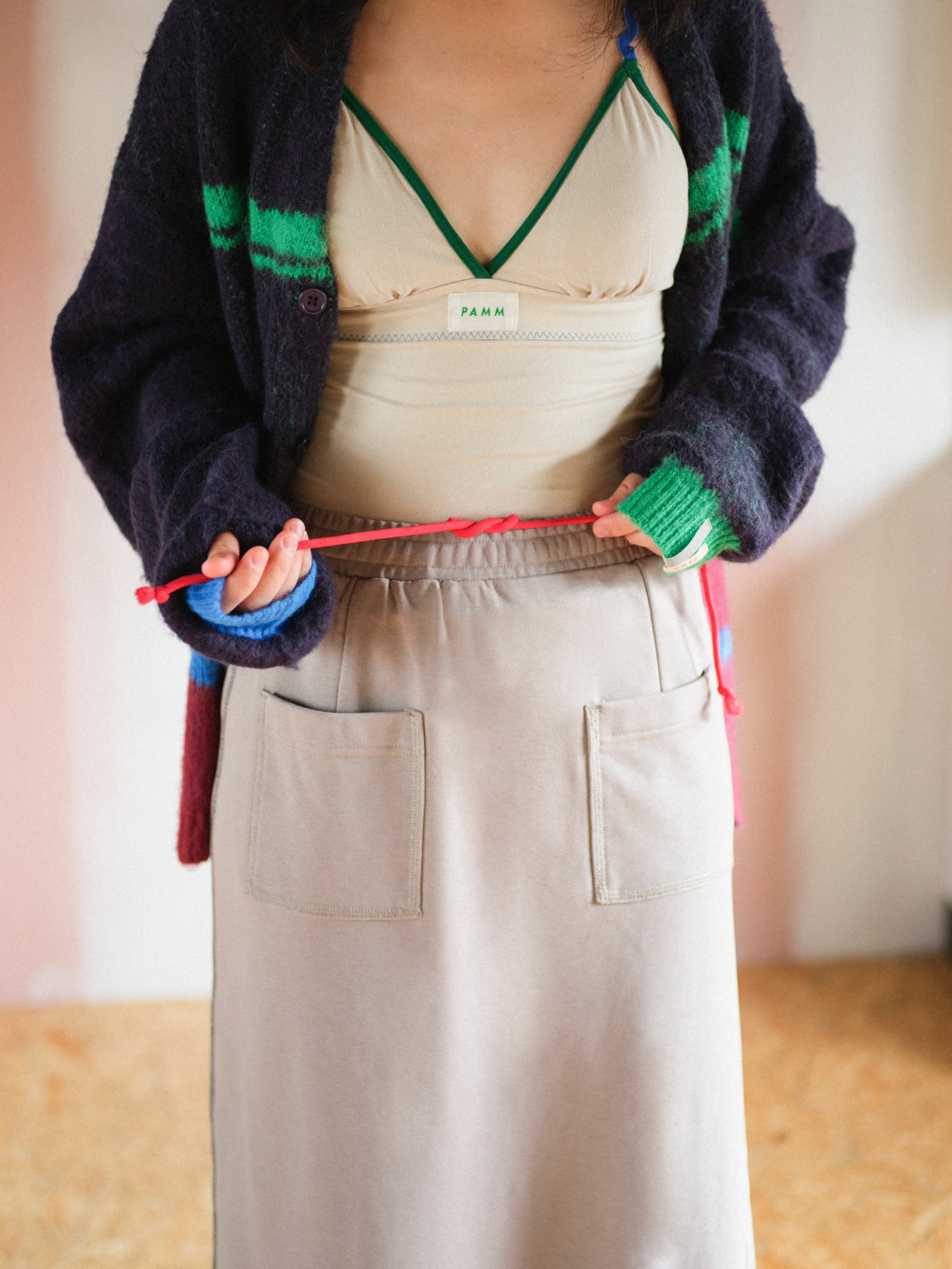 ウエストは紐で調整できるため、体型に合わせて幅広く着ていただけます。